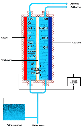 - Es werden zwei Flüssigkeiten produziert: Anolyte und Catholyte. Die Eigenschaften dieser zwei Flüssigkeiten sind unten erklärt.